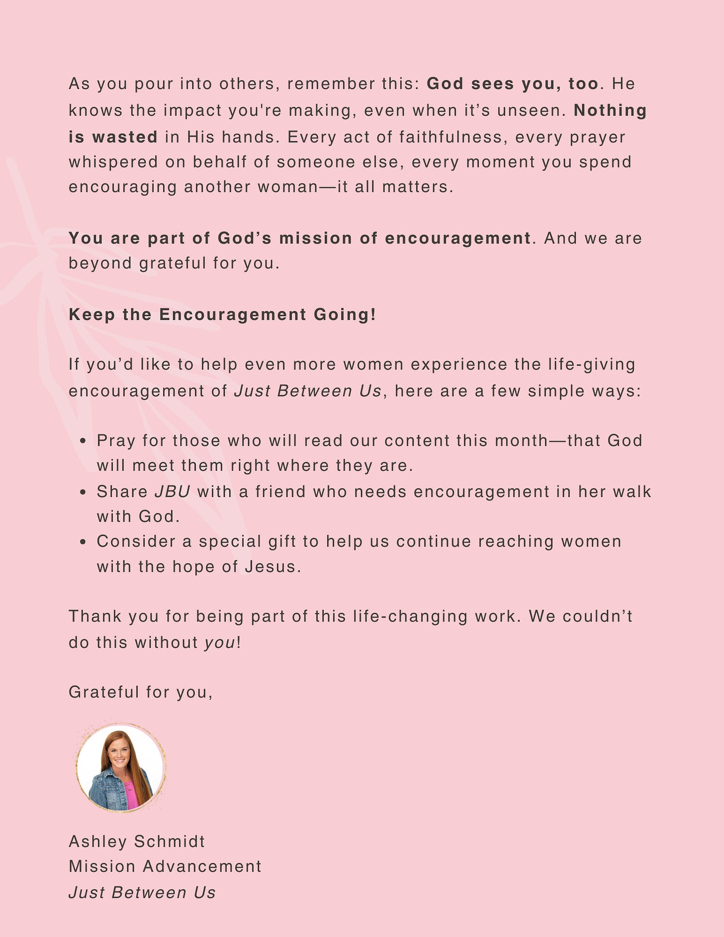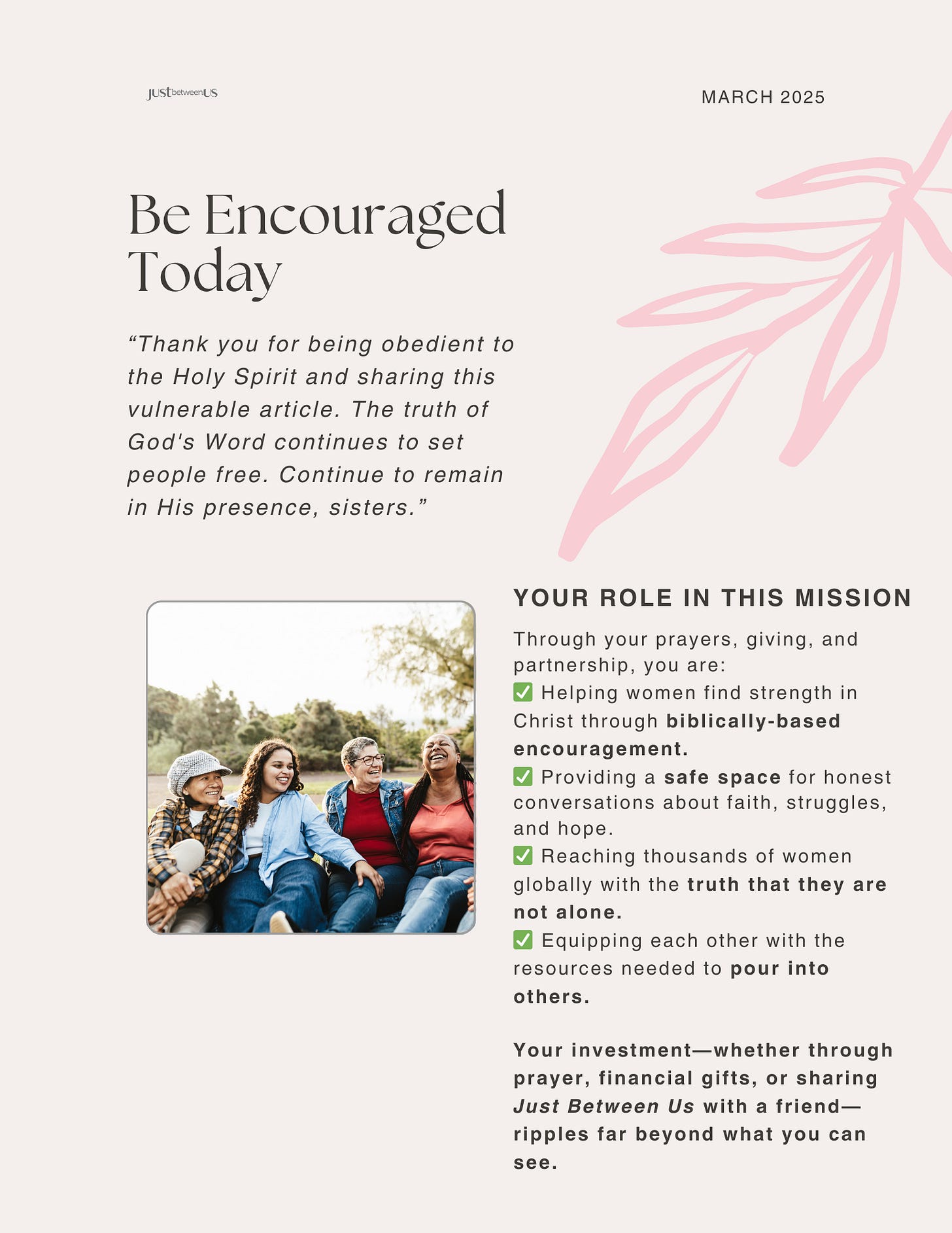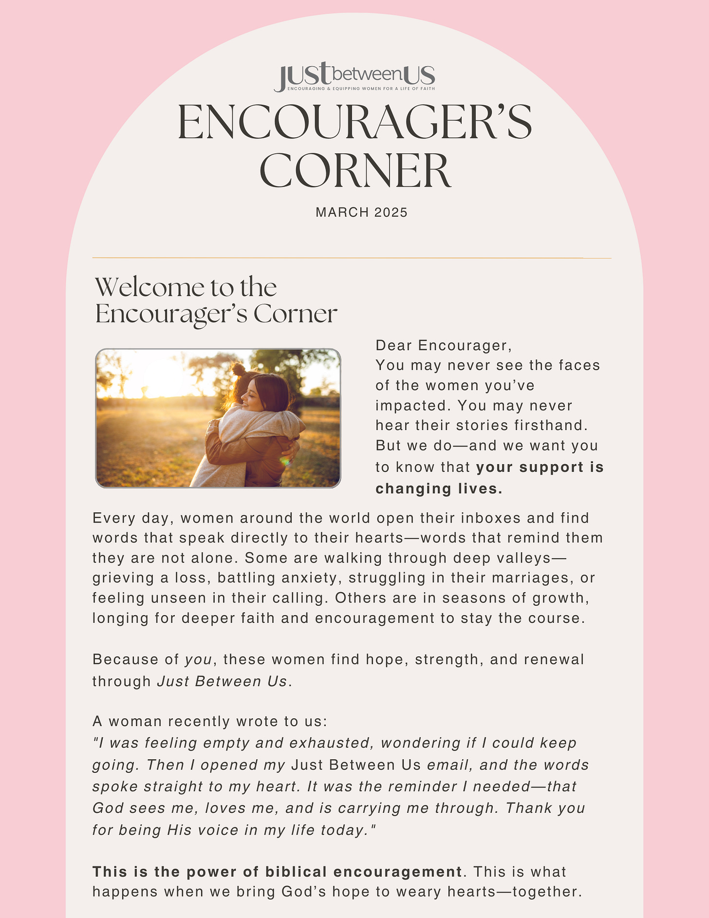 Encourager's Corner | March 2025 You Are Making a Difference – More Than You KnowJust Between Us magazineMar 08, 20256ShareGive the Gift of EncouragementPreviousNext